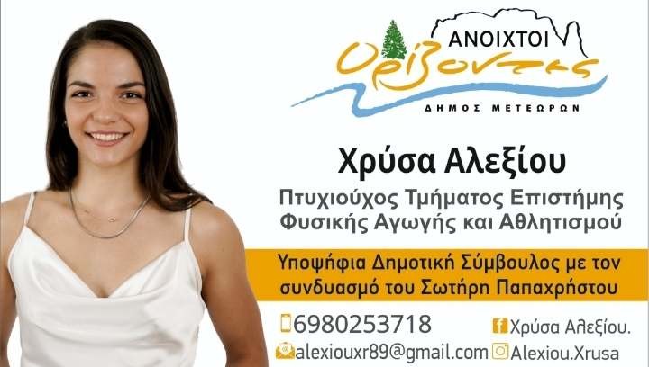 Χρύσα Αλεξίου – Υποψήφια Δημοτική Σύμβουλος με τον Συνδυασμό “ΑΝΟΙΧΤΟΙ ΟΡΙΖΟΝΤΕΣ” του Σωτήρη Παπαχρήστου
