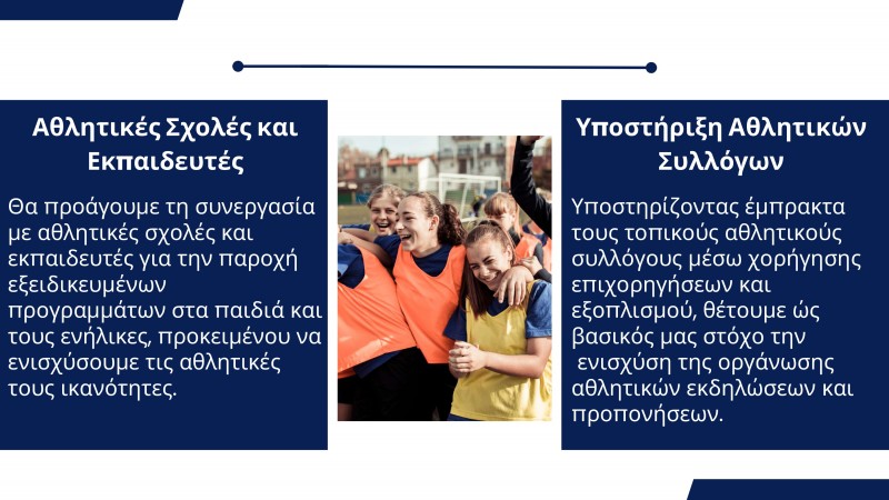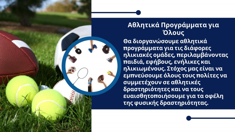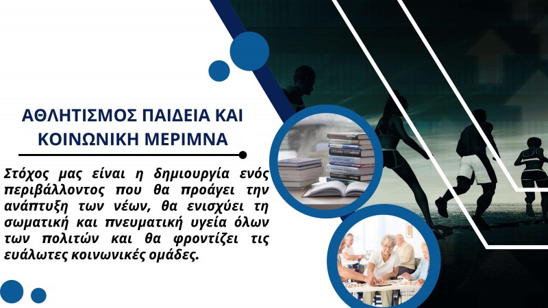 Η προσοχή μας σε αυτές τις πτυχές δεν είναι τυχαία. Αθλητισμός, Παιδεία και Κοινωνική Μέριμνα είναι θεμέλιοι λίθοι για μια δυναμική και ενωμένη κοινωνία. Από τον αθλητισμό, που προωθεί την υγεία και την ομαδικότητα, στην παιδεία, που είναι ο δρόμος προς την προσωπική και επαγγελματική ανάπτυξη, και την κοινωνική μέριμνα, που εξασφαλίζει ότι κανένας δεν παραμένει πίσω, η παράταξή μας επενδύει σε ένα καλύτερο μέλλον για τους πολίτες μας.