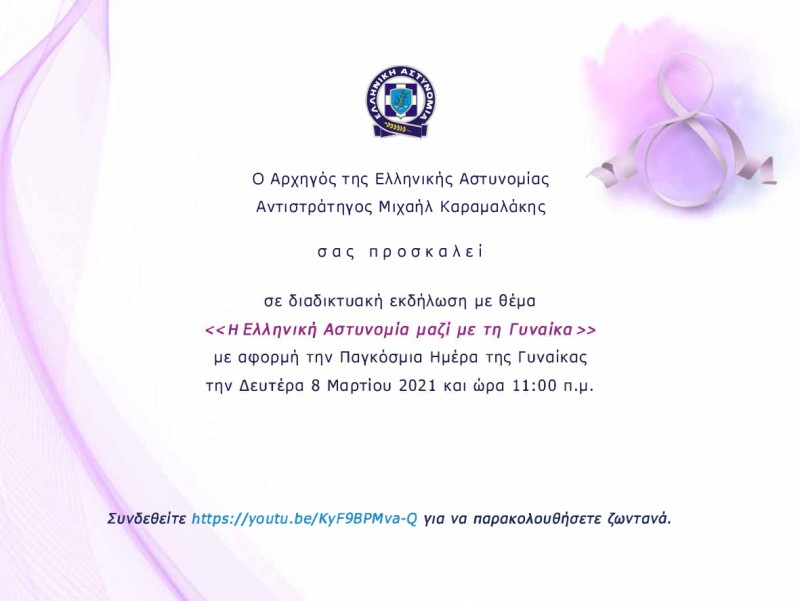 Το Αρχηγείο της Ελληνικής Αστυνομίας, με αφορμή την αυριανή Παγκόσμια Ημέρα της Γυναίκας, διοργανώνει διαδικτυακή εκδήλωση με θέμα: