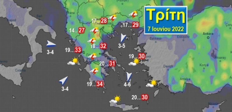 Άνεμοι: στο Ιόνιο μεταβλητοί ασθενείς 3-4 Μποφόρ, στο Αιγαίο Βοριάδες μέτριοι έως ισχυροί 4-6 Μποφόρ. Θερμοκρασίες: Στα ηπειρωτικά από 13 έως 34, στα παραθαλάσσια και στα νησιά από 18 έως 31 βαθμούς.