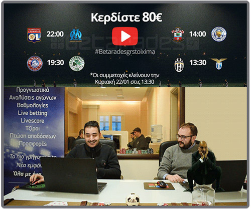 Δείτε τα απολαυστικά βίντεο του Betarades.gr μάθετε ποιες είναι οι πέντε αναμετρήσεις που προσφέρονται για προγνωστικό και διεκδικείστε κάρτες συνολικής αξίας 80€ για online Στοιχηματισμό.