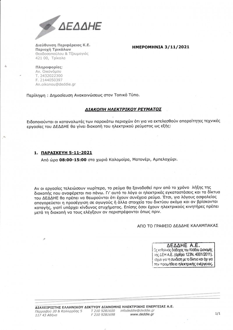 Προγραμματισμένη διακοπή ρεύματος σε χωριά του Δήμου Μετεώρων θα πραγματοποιηθεί την Παρασκευή 5/11 για απαραίτητες εργασίες της ΔΕΔΔΗΕ στα παρακάτω χωριά: Αμπελοχώρι, Καλομοίρα, Ματονέρι από τις 08:30 π.μ έως τις 15:00 μ.μ.
