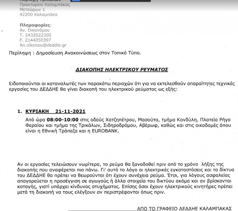 Σύμφωνα με νεότερη ανακοίνωση της ΔΕΔΔΗΕ η ρευματοδότηση θα διακοπή στις εξής οδούς: Χατζηπέτρου, Μασούτα, Τμήμα Κονδύλη, πλατεία Ρήγα Φεραίου, και τμήμα της Τρικάλων, Σιδηροδρόμου, Αβέρωφ, και στις οικοδομές που είναι η Εθνική Τράπεζα και η EUROBANK.