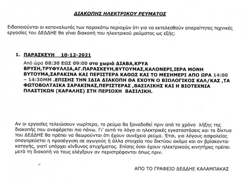 Διακοπή ρεύματος θα πραγματοποιηθεί την Παρασκευή 10 Δεκεμβρίου σε χωριά της Καλαμπάκας σύμφωνα με ανακοίνωση της ΔΕΔΔΗΕ.