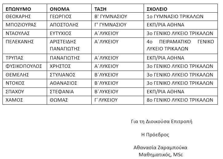 Η Πρόεδρος και η Διοικούσα Επιτροπή του Παραρτήματος Τρικάλων της Ελληνικής Μαθηματικής Εταιρείας συγχαίρουμε θερμά τους μαθητές/τριες μας που διακρίθηκαν στον 82ο διαγωνισμό Μαθηματικών « Ο Θαλής» και τους ευχόμαστε Καλή Επιτυχία στην επόμενη φάση, στην Εθνική Μαθηματική Ολυμπιάδα «Ο Αρχιμήδης» η οποία θα διεξαχθεί το Σάββατο 26 Φεβρουαρίου2022.