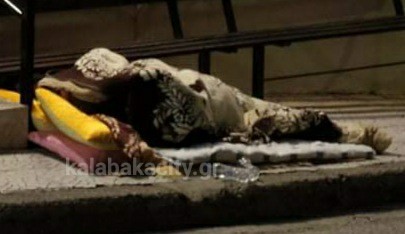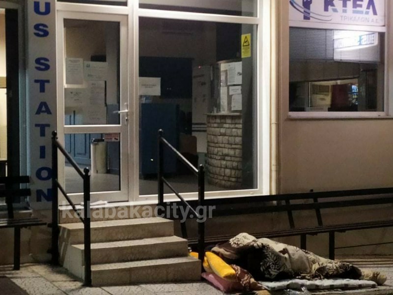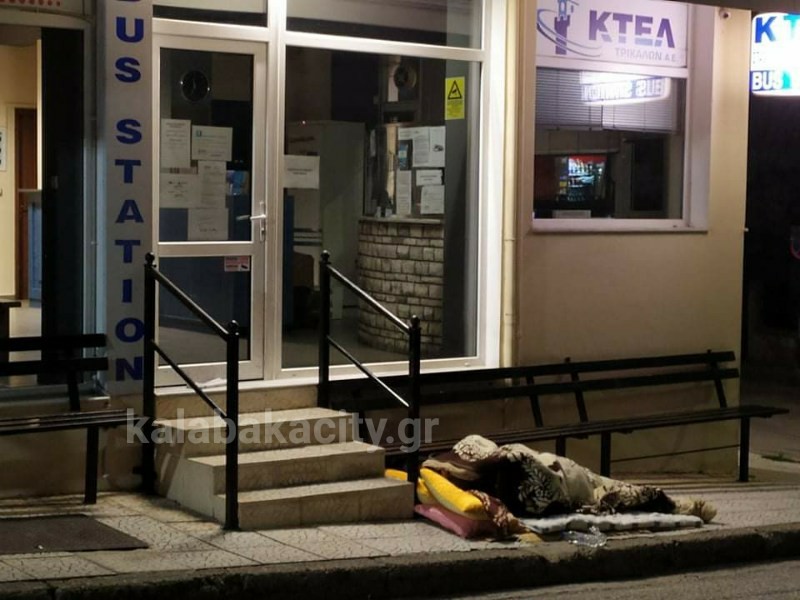 Έξω από το ΚΤΕΛ Καλαμπάκας, στο πεζοδρόμιο, δυο άτομα, κοιμούνται εκτεθειμένα στο κρύο και σε όποιον κίνδυνο μπορεί να προκύψει!