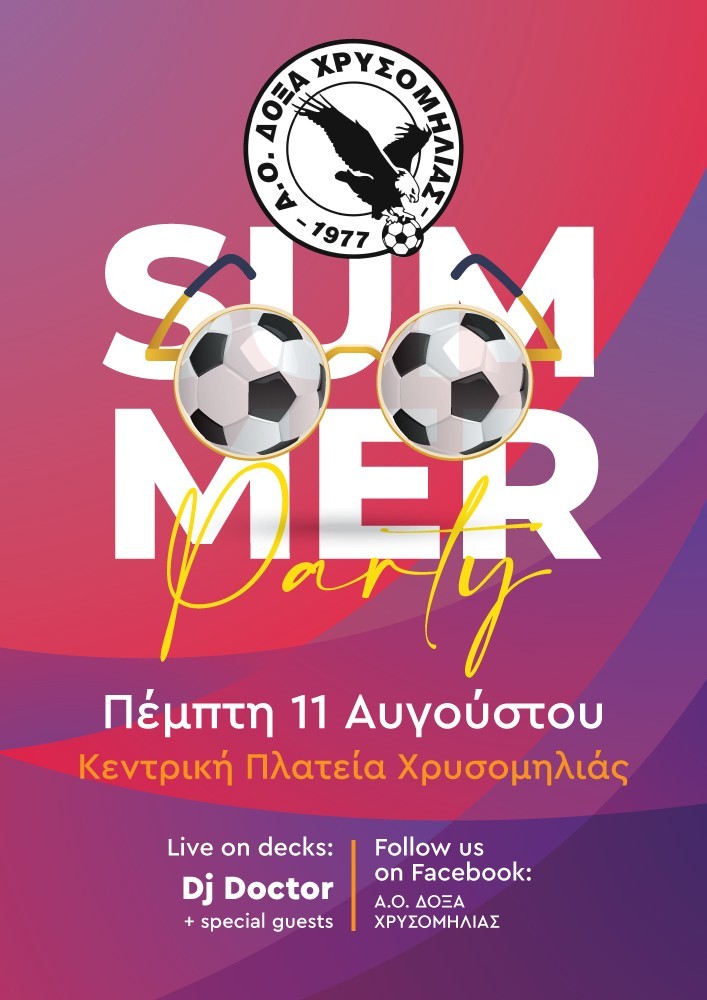 Πέμπτη 11 Αυγούστου στην πλατεία της Χρυσομηλιάς θα διασκεδάσετε παρέα με τον Α.Ο Δόξα Χρυσομηλιάς με τον dj Doctor – Σάκη Αργύρη στα decks σε μια μοναδική βραδιά!