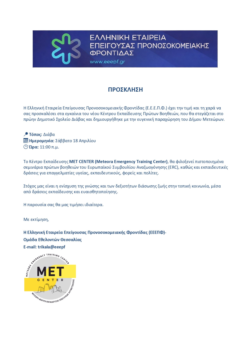 Η Ελληνική Εταιρεία Επείγουσας Προνοσοκομειακής Φροντίδας (Ε.Ε.Ε.Π.Φ.) έχει την τιμή και τη χαρά να σας προσκαλέσει στα εγκαίνια του νέου Κέντρου Εκπαίδευσης Πρώτων Βοηθειών, που θα στεγάζεται στο πρώην Δημοτικό Σχολείο Διάβας και δημιουργήθηκε με την ευγενική παραχώρηση του Δήμου Μετεώρων.