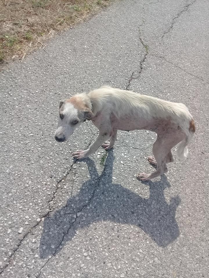 Το σκυλί των φωτογραφιών βρέθηκε σε άθλια κατάσταση, με λουρί και τυλιγμένο σύρμα στο λαιμό του να περιφέρεται σε περιοχή της Διάβας.