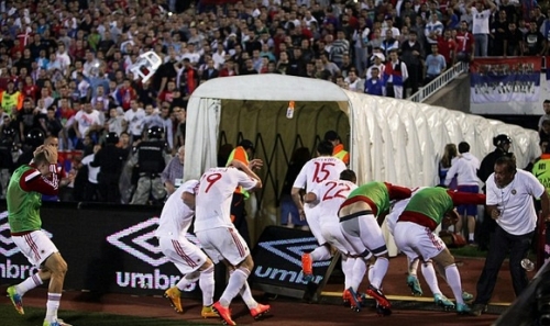 Η αναμέτρηση ανάμεσα στη Σερβία και την Αλβανία διεκόπη όταν ο Στέφαν Μίτροβιτς κατέβασε σημαία που απεικονίζει την ιδέα της “Μεγάλης Αλβανίας”, από τηλεκατευθυνόμενο αεροπλανάκι. Ακολούθησε σύρραξη.