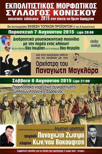 Διοργανώνει πολιτιστικές εκδηλώσεις στις 7 και 8 Αυγούστου 2015 στην πλατεία του πρώην Δημαρχείου και νυν Κ.Ε.Π. Κονισκού.