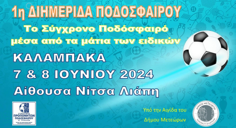 Διημερίδα Ποδοσφαίρου με τίτλο «Το σύγχρονο Ποδόσφαιρο μέσα από τα μάτια των ειδικών», διοργανώνει ο Σύνδεσμος Προπονητών ν. Τρικάλων υπό την αιγίδα του Δήμου Μετεώρων. Η ενημερωτική ημερίδα αναμένεται να πραγματοποιηθεί την Παρασκευή 7 και το Σάββατο 8 Ιουνίου 2024 στην Αίθουσα «Νίτσα Λιάπη» στην Καλαμπάκα. Συντονιστής της διημερίδας θα είναι ο δημοσιογράφος Γιώργος Παπαγεωργόπουλος.