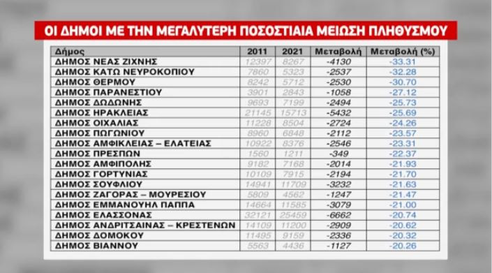Ποιοι είναι οι 19 δήμοι με την μεγαλύτερη ποσοστιαία μείωση πληθυσμού