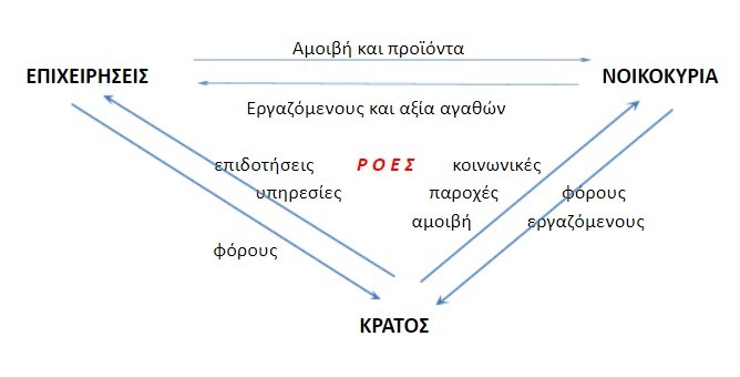 Τέλος, στο κοινωνικό σύνολο που ζούμε, είτε ως άτομα ή νοικοκυριά, είτε ως επιχειρήσεις, είτε ως κράτος, έχουμε μεταξύ μας διάφορες συναλλαγές, π.χ. η επιχείρηση παίρνει εργαζόμενους από τα νοικοκυριά και αντίστοιχα οι εργαζόμενοι παίρνουν αμοιβή από τις επιχειρήσεις.