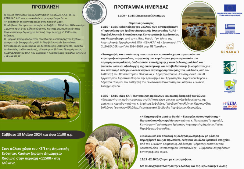 Ο Δήμος Μετεώρων και η Αναπτυξιακή Τρικάλων Α.Α.Ε. Ο.Τ.Α. – ΚΕΝΑΚΑΠ Α.Ε. σας προσκαλούν στην ενημερωτική ημερίδα με θέμα «Η ανάπτυξη της κτηνοτροφίας στην περιοχή μας». Η εκδήλωση θα πραγματοποιηθεί το Σάββατο 18 Μαΐου 2024 και ώρα 11:00 το πρωί στον αύλειο χώρο του ΚΕΠ της Δημοτικής Ενότητας Χασίων (πρώην Δημαρχείο Χασίων) στην περιοχή «11500» στη Μύκανη. Η ημερίδα πραγματοποιείται στο πλαίσιο υλοποίησης του Σχεδίου Διακρατικής Συνεργασίας ALIAS – Περιβαλλοντικές Επιπτώσεις Κτηνοτροφικής Διαδικασίας και Μεταποίηση (ALlevamento, Impatto Ambientale, traSformazione), ΤΟΥ ΥΠΟΜΕΤΡΟΥ 19.3 ΤΟΥ ΠΡΟΓΡΑΜΜΑΤΟΣ CLLD/LEADER ΤΟΥ ΠΑΑ, που υλοποιεί η Αναπτυξιακή Τρικάλων ΑΑΕ ΟΤΑ – ΚΕΝΑΚΑΠ ΑΕ.