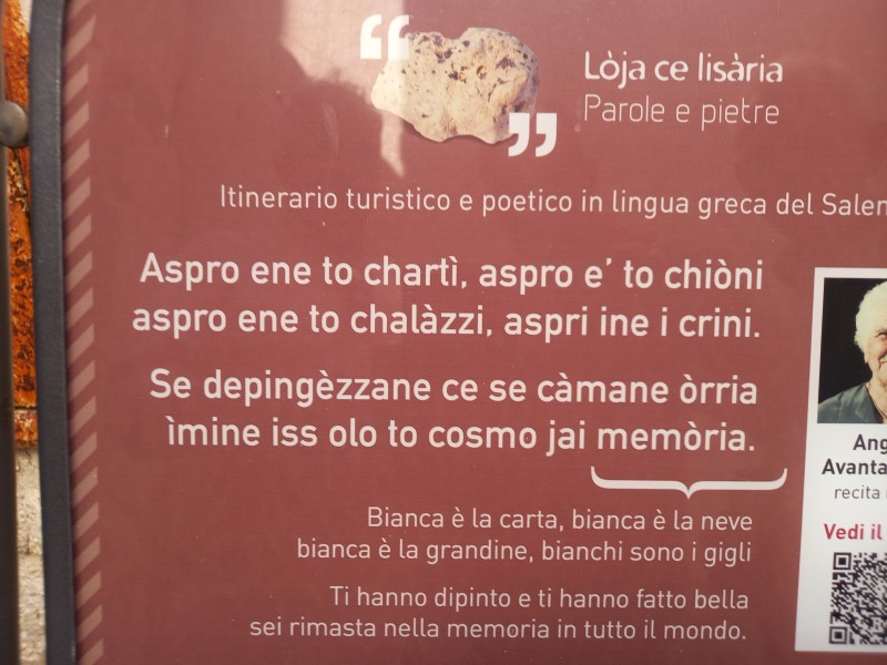 Το ελληνικό στοιχείο διατηρείται σε πολύ υψηλά επίπεδα καθώς οι οδοί, οι πινακίδες, οι ανακοινώσεις γραμμένες στην ελληνική γλώσσα ή στην τοπική διάλεκτο Grico αναγεννάνε τον ελληνικό πολιτισμό και την υπερηφάνεια που διακρίνει τους κατοίκους για την Ελλάδα μας.