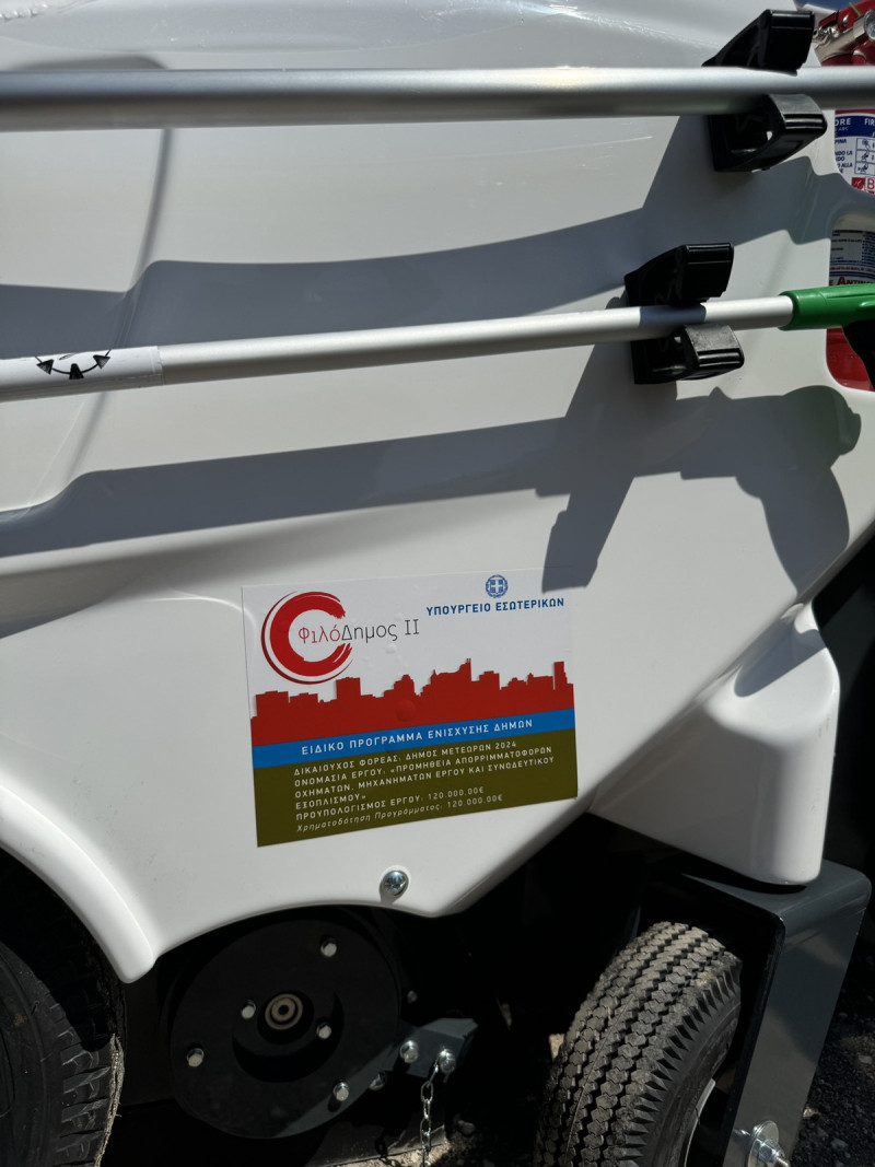 Με νέα σύγχρονα μηχανήματα ενισχύει τον στόλο των μηχανημάτων του ο Δήμος Μετεώρων και ενδυναμώνει τον εξοπλισμό του στον τομέα της καθαριότητας και του πρασίνου. Συγκεκριμένα, το πρωί της Παρασκευής πραγματοποιήθηκε η παραλαβή δύο νέων ηλεκτρικών σαρώθρων πεζού χειριστή καθώς και ενός τεμαχιστή κλαδιών σε τρέιλερ με πετρελαιοκινητήρα. Ο νέος εξοπλισμός είναι συνολικού προϋπολογισμού ένταξης 120.000 ευρώ και χρηματοδοτήθηκε από το Πρόγραμμα του Υπουργείου Εσωτερικών «Φιλόδημος ΙΙ».