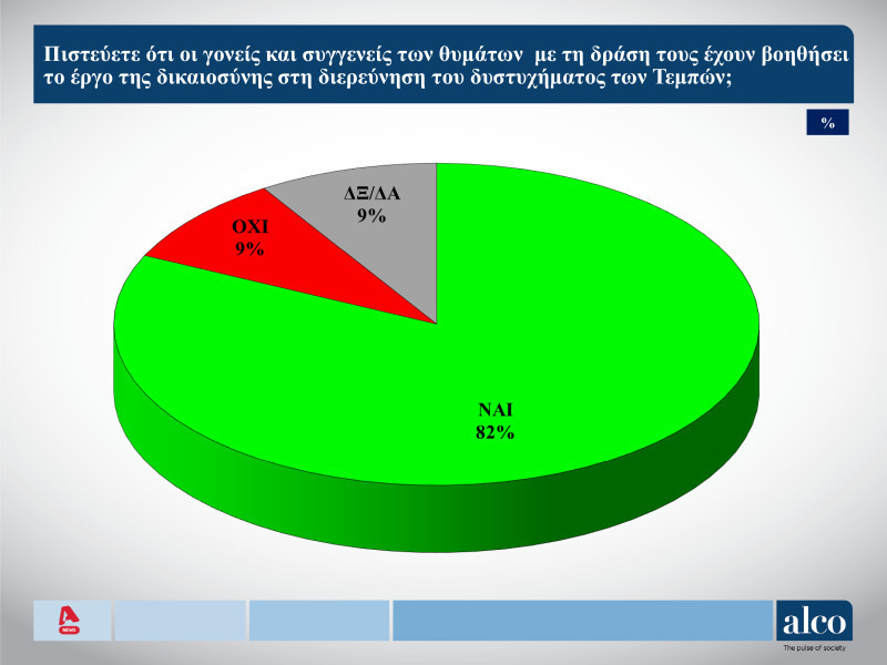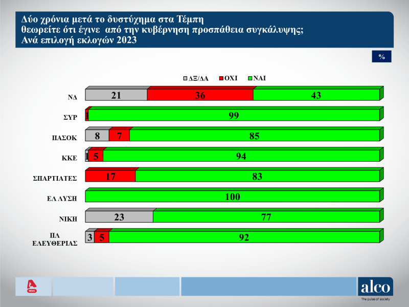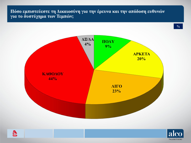 Προσπάθεια συγκάλυψης του δυστυχήματος των Τεμπών από την κυβέρνηση βλέπει η συντριπτική πλειοψηφία της κοινής γνώμης, αντιμετωπίζοντας μάλιστα δύσπιστα τον θεσμό της Δικαιοσύνης σύμφωνα με το πρώτο μέρος της δημοσκόπησης της ALCO, για λογαριασμό του ALPHΑ.