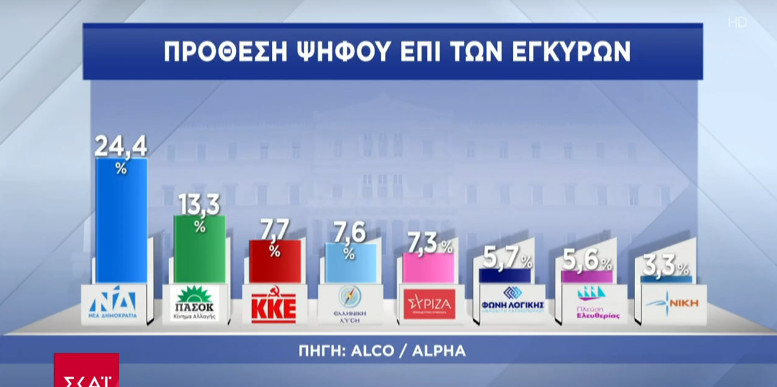 Σε ό,τι αφορά την πρόθεση ψήφου επί των εγκύρων πρώτο κόμμα παραμένει η ΝΔ συγκεντρώνοντας 24,4% (υποχωρώντας από το 26,5% στην έρευνα του Ιανουαρίου), δεύτερο κόμμα το ΠΑΣΟΚ με 13,3% (από 14,5%), τρίτο κόμμα το ΚΚΕ με 7,7% (από 8,6%), τέταρτο κόμμα η Ελληνική Λύση με 7,6% (από 7,7%) και πέμπτο κόμμα ο ΣΥΡΙΖΑ με 7,3% (από 7,7%).