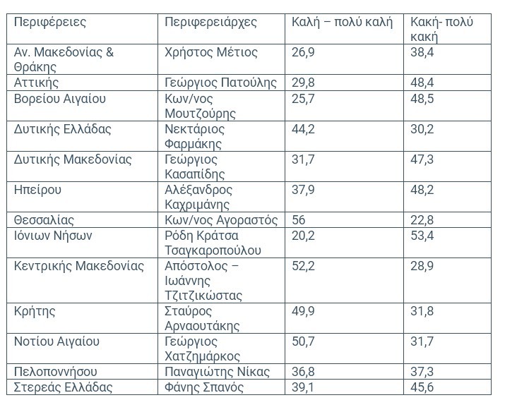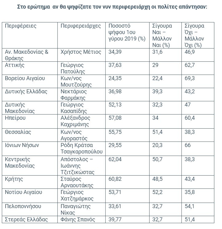 Οι περιφερειάρχες Κεντρικής Μακεδονίας, Κρήτης, Θεσσαλίας και Νοτίου Αιγαίου, οι οποίοι είχαν εκλεγεί από τον πρώτο γύρο το 2019 εμφανίζουν μια αυξημένη δυναμική και φαίνεται να επανεκλέγονται ξανά από την πρώτη Κυριακή ενώ οι περιφερειάρχες Ηπείρου & Δυτικής Μακεδονίας φαίνεται πως θα οδηγηθούν σε δεύτερο γύρο. Θα πρέπει να σημειωθεί ότι τα στοιχεία της έρευνας αφορούν τη δυναμική του πρώτου γύρου και δεν αποκλείουν να υπερψηφιστεί ένας από τους εν ενεργεία περιφερειάρχες στον δεύτερο γύρο, καθώς η εκλογική μάχη εκεί καθορίζεται από πολλούς παράγοντες και συμμαχίες.