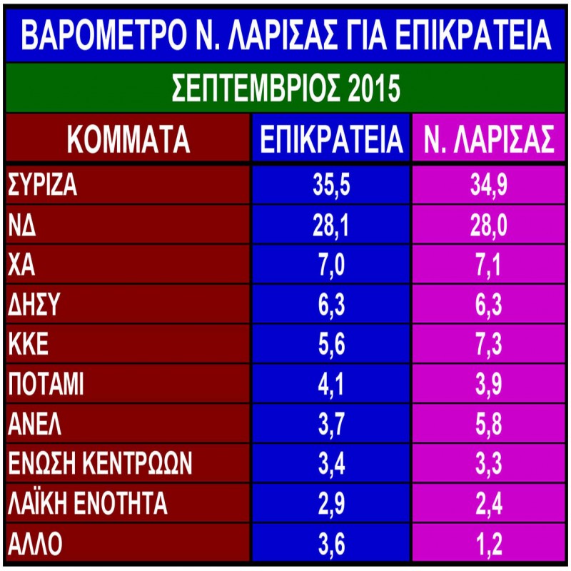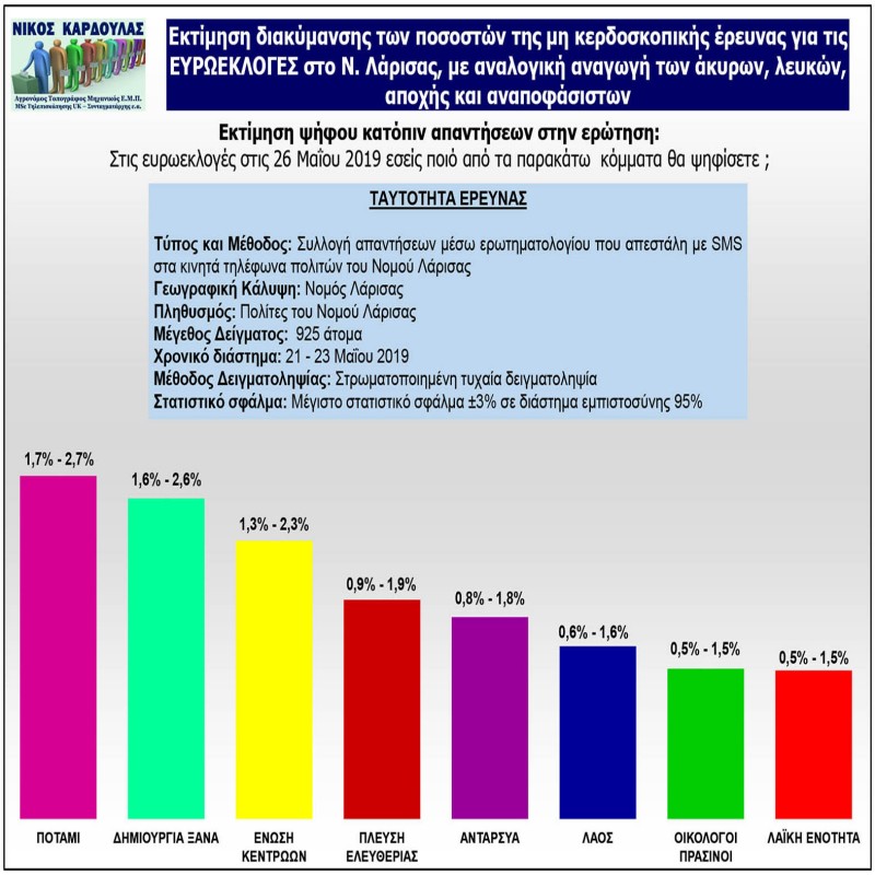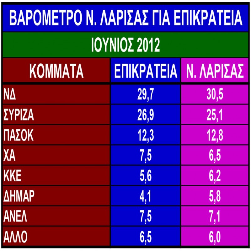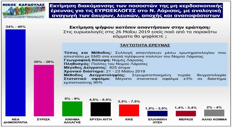 Άνετη νίκη της ΝΔ στις ευρωεκλογές και με μεγάλη διαφορά από το ΣΥΡΙΖΑ που θα κυμαίνεται από 8 έως 20 μονάδες, σύμφωνα με δική μου ΔΗΜΟΣΚΟΠΗΣΗ που αφορά την ΕΠΙΚΡΑΤΕΙΑ, αφού ο Νομός Λάρισας στον οποίο έγινε η έρευνα, αποτελεί βαρόμετρο και για την επικράτεια, γεγονός που επιβεβαιώνεται από τις συνημμένες εικόνες σε προηγούμενες εκλογικές αναμετρήσεις.