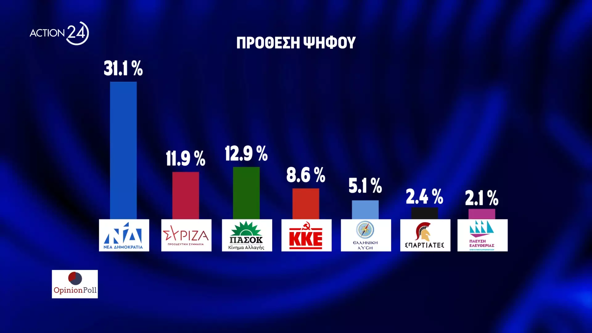 Ύστερα από πολλά χρόνια, το ΠΑΣΟΚ πέρασε στη δεύτερη θέση, αφήνοντας τρίτο τον ΣΥΡΙΖΑ, στη δημοσκόπηση που διενήργησε η Opinion Poll για το Action24, την ώρα που η Νέα Δημοκρατία παραμένει κυρίαρχη.