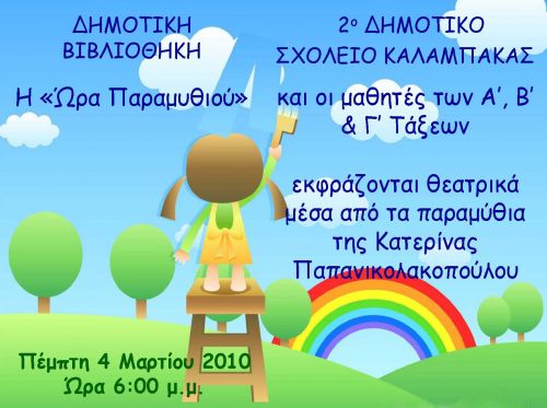 Μια ακόμη εκδήλωση πρόκειται να πραγματοποιηθεί από την Δημοτική Βιβλιοθήκη Καλαμπάκας στην “Ώρα Παραμυθιού”. Μια ακόμη εκδήλωση πρόκειται να πραγματοποιηθεί από την Δημοτική Βιβλιοθήκη Καλαμπάκας στην “Ώρα Παραμυθιού”. Την Πέμπτη 4 Μαρτίου στις 18:00 μ.μ η “‘Ωρα Παραμυθιού” της Δημοτικής Βιβλιοθήκης σε συνεργασία με τους μαθητές των Α’, Β’ και Γ’ τάξεων του 2ου Δημοτικού Σχολείου Καλαμπάκας εκφράζονται θεατρικά μέσα από τις ιστορίες των βιβλίων της συγγραφέως Κατερίνας Παπανικολοπούλου.