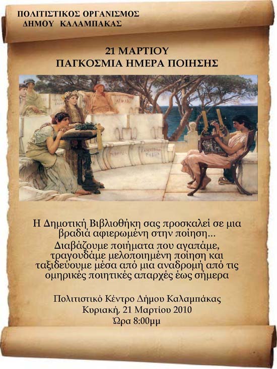 Η Δημοτική Βιβλιοθήκη σας προσκαλεί την ερχόμενη Κυριακή 21 Μαρτίου στις 8:00 μ.μ σε μια βραδιά αφιερωμένη στην ποίηση…