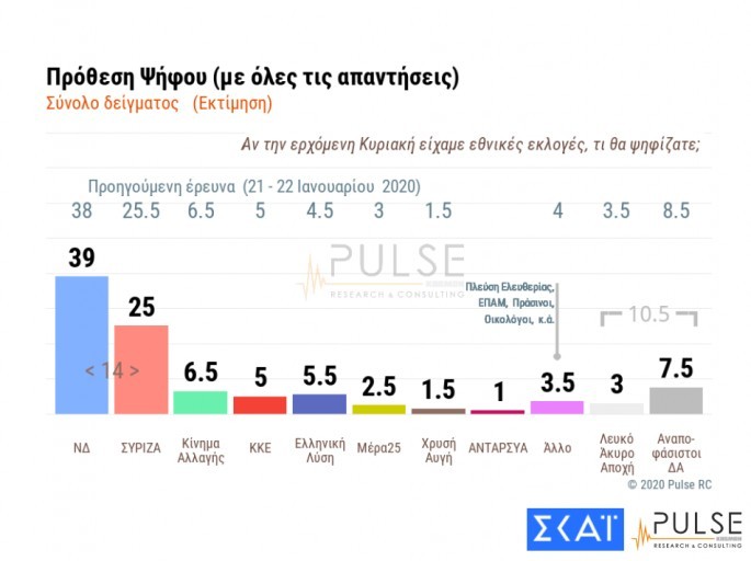 Με 14 μονάδες προηγείται η Νέα Δημοκρατία έναντι του ΣΥΡΙΖΑ στη δημοσκόπηση της Pulse για λογαριασμό του ΣΚΑΙ.
