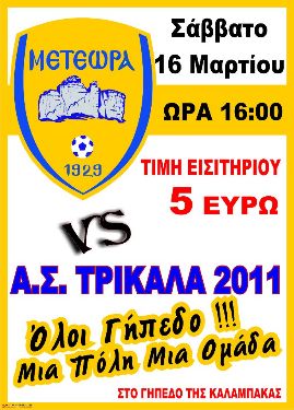 Αύριο Σάββατο το μεσημέρι στις 16:00 θα γίνει το πολυσυζητημένο παιχνίδι του νομού και της Εθνικής κατηγορίας, μεταξύ των ομάδων ΑΣ Μετέωρα και Τρίκαλα.