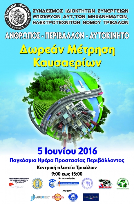 Με αφορμή την Παγκόσμια Ημέρα Προστασίας του Περιβάλλοντος ο σύνδεσμος μας διοργανώνει την Κυριακή 5 Ιουνίου στην Κεντρική Πλατεία Τρικάλων την εκδήλωση ΑΝΘΡΩΠΟΣ- ΠΕΡΙΒΑΛΛΟΝ- ΑΥΤΟΚΙΝΗΤΟ.