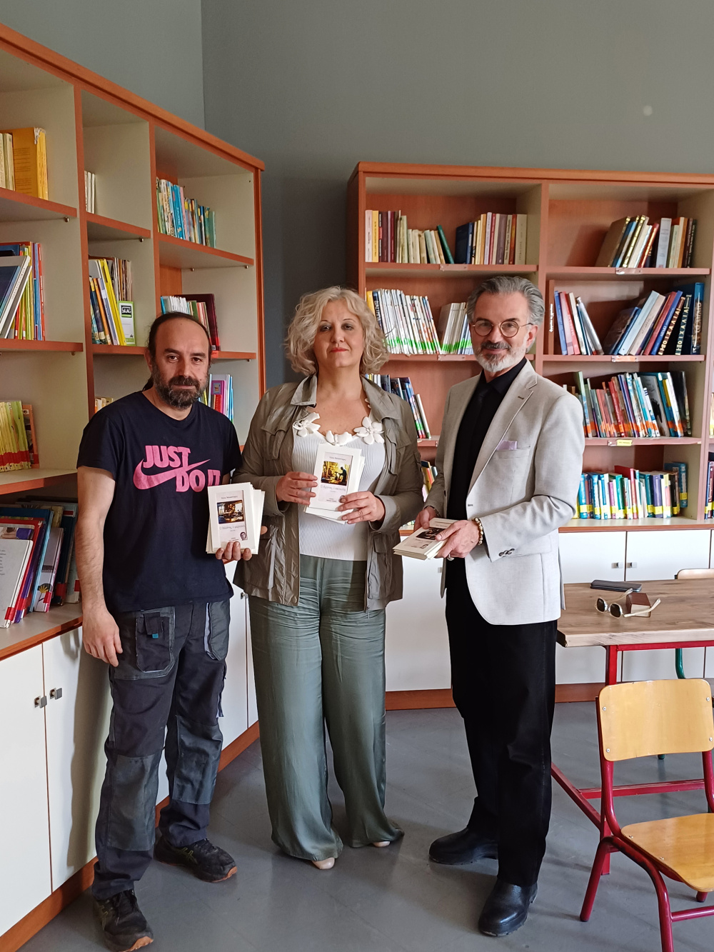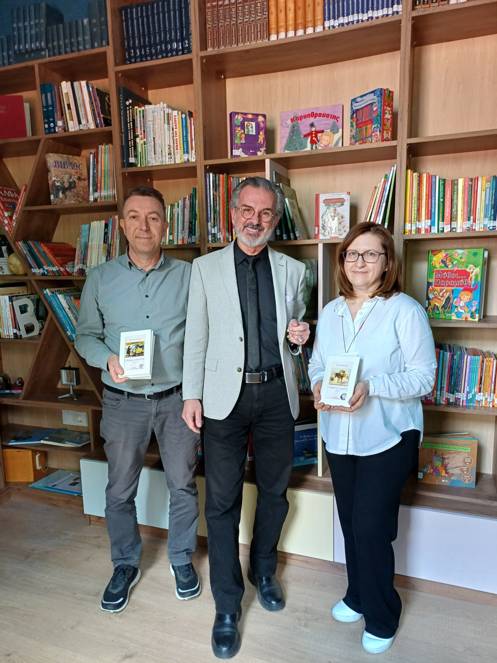 «Είχα τη χαρά σήμερα να υποδεχτώ στο σχολείο μας τον καταξιωμένο εικαστικό και αστείρευτο συγγραφέα κ. Μπουντούρη Ηλία. Ο λόγος ήταν ο εμπλουτισμός της δανειστικής βιβλιοθήκης μας με μια σειρά από Audio Books, τα οποία περιλαμβάνουν ηχογραφημένες αφηγήσεις από γνωστούς καλλιτέχνες. Στις ιστορίες αναδεικνύονται τα Ελληνικά Ξεχασμένα Επαγγέλματα, ενώ πρωταγωνιστές είναι παλιοί επαγγελματίες. Ένα σημαντικό εργαλείο στα χέρια του εκπαιδευτικού, το οποίο πρόσφερε ο Τρικαλινός συμπατριώτης μας κ. Λεωνίδας Τζαμγιώζης, απόφοιτος του σχολείου μας.