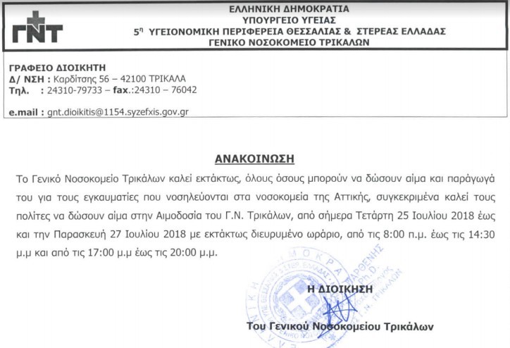 Σε ανακοίνωση προχώρησε η Διοίκηση του Γενικού Νοσοκομείου Τρικάλων για τους εγκαυματίες της Αττικής σχετικά με αιμοδοσία.