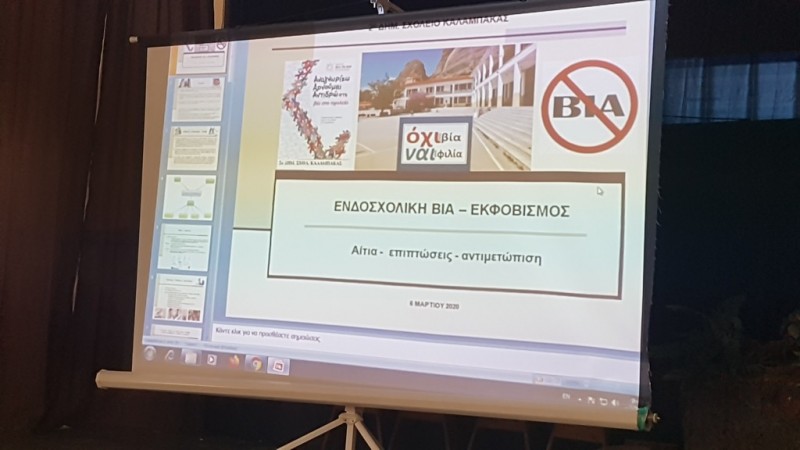Συνεχίζοντας τις δράσεις του το 2ο Δημοτικό Σχολείο Καλαμπάκας και μετά την ολική απολύμανση (αντιμικροβιακή) του σχολείου την Τετάρτη 4 Μαρτίου 2020, στα πλαίσια πρόληψης και αποφυγής ιώσεων εντός της σχολικής μονάδας καθώς υπάρχει έξαρση εποχικής γρίπης, κατόπιν αίτησης του Διευθυντή του σχολείου προς την Διεύθυνση Υγείας και Κοινωνικής Μέριμνας της Π. Ε. Τρικάλων και την άμεση ανταπόκριση της, πραγματοποιήθηκε σήμερα Παρασκευή 6 Μαρτίου 2020, στην αίθουσα εκδηλώσεων του σχολείου εκδήλωση για την «Πανελλήνια ημέρα κατά της Σχολικής Βίας και του Εκφοβισμού», σύμφωνα με τις οδηγίες του Υπουργείου Παιδείας που αναφέρεται προς όλα τα σχολεία της Ελλάδος.