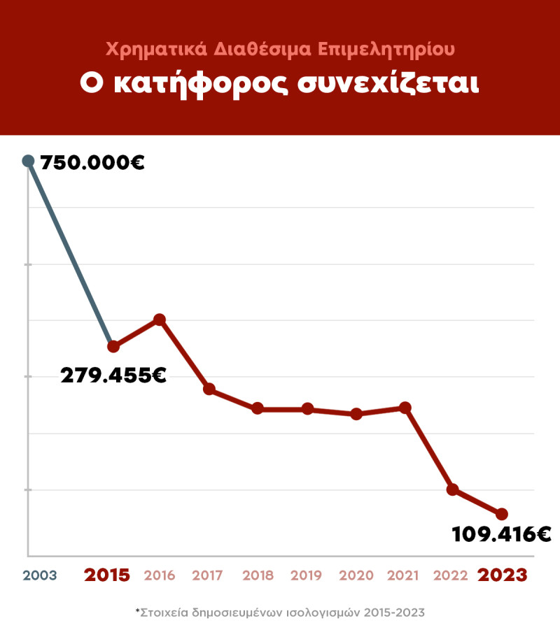 Όπως φαίνεται και στον σχετικό πίνακα η πορεία των διαθεσίμων κάθε χρόνο βαίνει συνεχώς μειούμενη (από 279.455 € το 2015 στα 109.416 € το 2023) με αποτέλεσμα οι συσσωρευμένες ζημιές το 2023 να ανέρχονται σε -230.722 €.