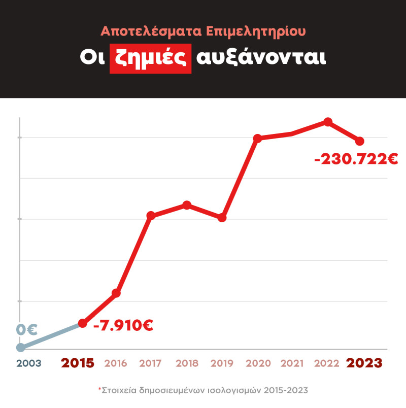Όπως φαίνεται και στον σχετικό πίνακα η πορεία των διαθεσίμων κάθε χρόνο βαίνει συνεχώς μειούμενη (από 279.455 € το 2015 στα 109.416 € το 2023) με αποτέλεσμα οι συσσωρευμένες ζημιές το 2023 να ανέρχονται σε -230.722 €.