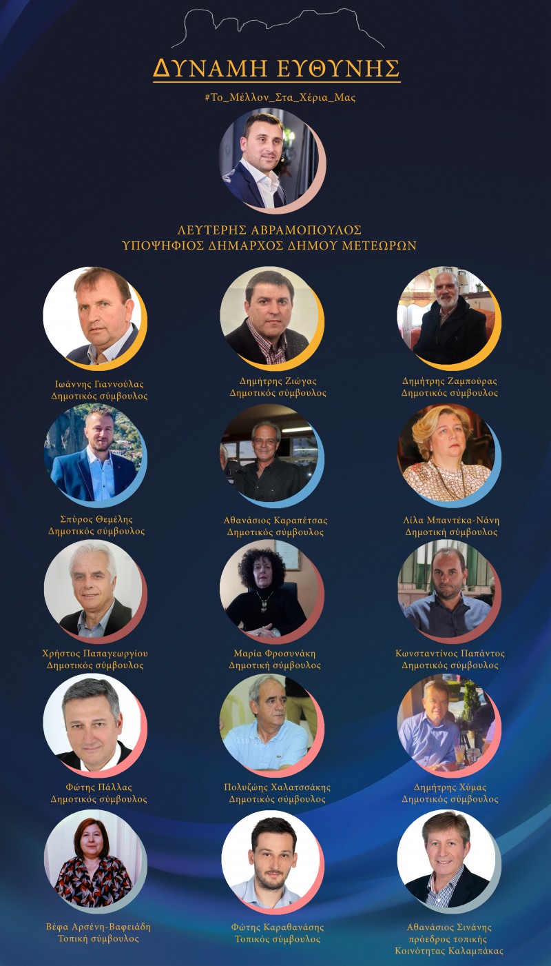 Μια νέα Δημοτική αρχή που θα δώσει μια νέα πνοή στην πόλη και στα χωριά μας, θα δώσει ευκαιρίες στους νέους μας να μείνουν και να δημιουργήσουν εδώ, θα καταστήσει τον Δήμο Μετεώρων πρωταγωνιστή των εξελίξεων.