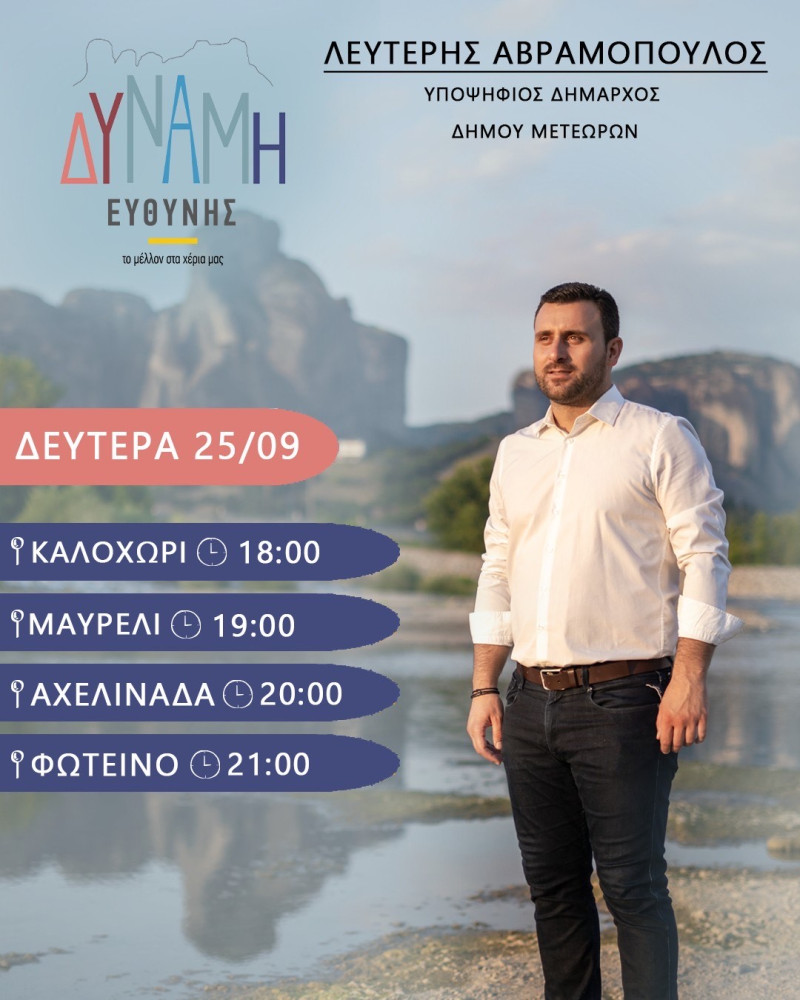 Ανακοινώθηκε το πρόγραμμα επισκέψεων του Υποψηφίου Δημάρχου Δήμου Μετεώρων Λευτέρη Αβραμόπουλου για τη Δευτέρα 25/9