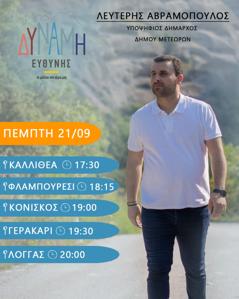 Ανακοινώθηκε το πρόγραμμα επισκέψεων του Υποψηφίου Δημάρχου Δήμου Μετεώρων Λευτέρη Αβραμόπουλου για την Πέμπτη 21/9