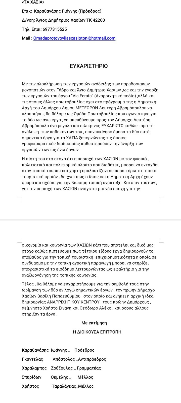 Με την ολοκλήρωση των εργασιών ανάδειξης των παραδοσιακών μονοπατιών στον Γάβρο και Άγιο Δημήτριο Χασίων, ως και την έναρξη των εργασιών του έργου “Via Ferata” (Αναρριχητικό πεδίο), αλλά και τις όποιες άλλες πρωτοβουλίες έχει στο πρόγραμμά της η Δημοτική Αρχή του Δημάρχου Δήμου ΜΕΤΕΩΡΩΝ Λευτέρη Αβραμόπουλου να υλοποιήσει, θα θέλαμε ως Ομάδα Πρωτοβουλίας που αγωνιστήκαμε για τα δύο ως άνω έργα, να απευθύνουμε προς τον Δήμαρχο Λευτέρη Αβραμόπουλο ένα μεγάλο και ειλικρινές ΕΥΧΑΡΙΣΤΩ καθώς, από την ανάληψη των καθηκόντων του, επανεκκίνησε τα δυο αυτά σημαντικά έργα για τα ΧΑΣΙΑ ξεπερνώντας τις όποιες γραφειοκρατικές διαδικασίες καθυστερούσαν την έναρξη των εργασιών των ως άνω έργων.