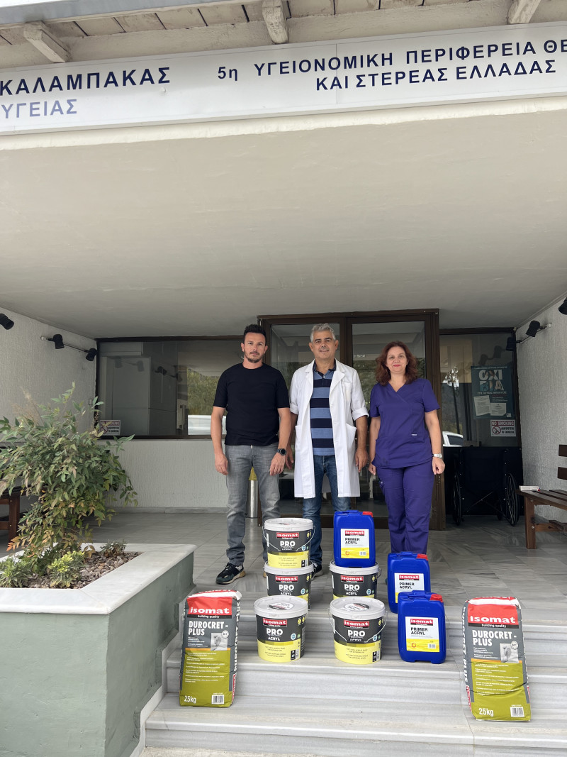 Το Κέντρο Υγείας Καλαμπάκας αισθάνεται την ανάγκη να ευχαριστήσει θερμά, την εταιρία «ISOMAT» 10ο χλμ. Αττικής οδού – Ελευσίνα, έξοδος 4, Ασπρόπυργος, για τη δωρεά επισκευαστικών υλικών και χρωμάτων για τις ανάγκες της δομής μας, καθώς και την εταιρία «PROFI SOLUTIONS PROUFOPOULOS» (Προυφόπουλος Αθανάσιος) που βρίσκεται στο 3ο χλμ. Εθνικής Οδού Καλαμπάκας – Τρικάλων, η οποία μεσολάβησε για τη δωρεά.