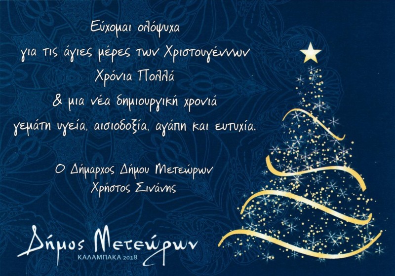 Ευχές του Δημάρχου Δήμου Μετεώρων Χρήστου Σινάνη Ανακοινώσεις Από admin Δημοσίευση Δεκ 24, 2018 -20:30 0 508 Κοινοποίηση FacebookTwitterΗλεκτρονικό ΤαχυδρομείοViber Εύχομαι ολόψυχα για τις άγιες μέρες των Χριστουγέννων Χρόνια Πολλά & μια νέα δημιουργική χρονιά γεμάτη υγεία, αισιοδοξία, αγάπη και ευτυχία. Ο Δήμαρχος Δήμου Μετεώρων Χρήστος Σινάνης 0 508 Κοινοποίηση