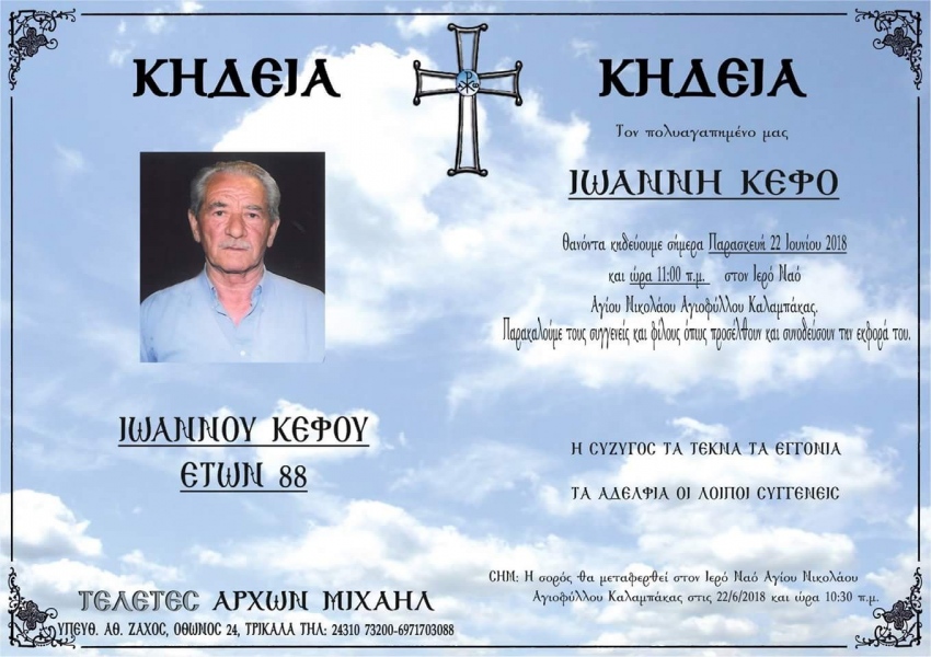 Έφυγε από την ζωή ο Ιωάννης Κέφος Ανακοινώσεις Από admin Δημοσίευση Ιούν 21, 2018 -11:59 0 1.784 Κοινοποίηση FacebookTwitterΗλεκτρονικό ΤαχυδρομείοViber Σε ηλικία 88 ετών έφυγε από την ζωή ο Ιωάννης Κέφος. Η κηδεία του θα γίνει την Παρασκευή 22 Ιουνίου στις 11:00 το πρωί από τον Ιερό Ναό Αγίου Νικολάου Αγιοφυλλου Καλαμπάκας. 0 1.784 Κοινοποίηση