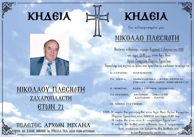 Σε ηλικία 71 ετών έφυγε από την ζωή ο Νικόλαος Πλεσιώτης γνωστός ζαχαροπλάστης των Τρικάλων.
