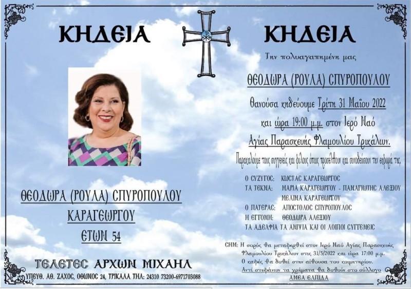 Κηδεύεται σήμερα Τρίτη 31 Μαΐου και ώρα 19.00 μ.μ. εκ του Ιερού Ναού Αγίας Παρασκευής Φλαμουλίου Τρικάλων.