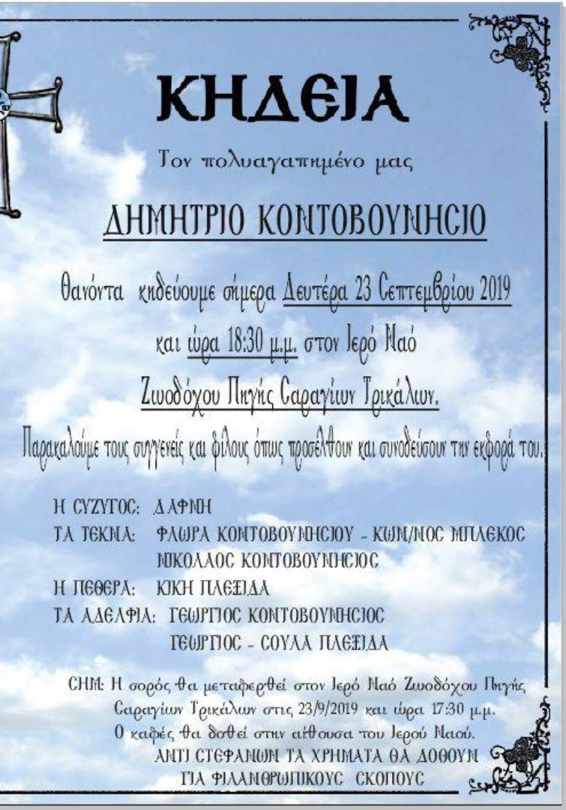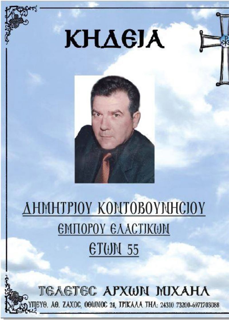 « Έφυγε » σε ηλικία 55 ετών ο Κοντοβουνήσιος Δημήτριος Ανακοινώσεις Από admin Δημοσίευση Σεπ 23, 2019 -8:14 0 2.146 Κοινοποίηση FacebookTwitterΗλεκτρονικό ΤαχυδρομείοViber Τον πολυαγαπημένο μας Δημήτριο Κοντοβουνήσιο ετών 55 ( έμπορος ελαστικών ) θανόντα κηδεύουμε σήμερα Δευτέρα 23 Σεπτεμβρίου και ώρα 18:30 στον Ιερό Ναό Ζωοδόχου Πηγής Σαραγίων Τρικάλων. 0 2.146 Κοινοποίηση