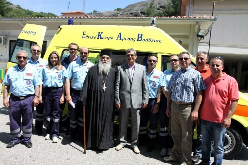 Την περασμένη Παρασκευή 12 Ιουνίου πραγματοποιήθηκαν στον αύλειο χώρο του Κέντρου Υγείας Καλαμπάκας τα εγκαίνια του νέου ασθενοφόρου του Κέντρου Υγείας Καλαμπάκας. Όπως είχαμε αναφέρει και σε προηγούμενο ρεπορτάζ η απόκτηση ενός νέου ασθενοφόρου αποτελούσε αίτημα χρόνων των εργαζομένων του Κέντρου Υγείας Καλαμπάκας διότι το ήδη υπάρχων ήταν αρκετά παλιό. Αφού το αίτημα των υπαλλήλων δεν έγινε ποτέ δεκτό από τους αρμόδιους φορείς εκείνοι στράφηκαν στη βοήθεια της Ιεράς Μονής Βαρλαάμ η οποία ανταποκρίθηκε στο άιτημά τους. Οι διαδικασίες ολοκληρώθηκαν και έτσι πριν λίγες μέρες το νεό ασθενοφόρο αξίας 70 χιλιάδων ευρώ παραδόθηκε στο Κέντρο Υγείας Καλαμπάκας. Τα εγκαίνια πραγματοποιήσε ο Σεβασμιώτατος Μητροπολίτης Σταγών και Μετεώρων κ.κ. Σεραφείμ παρουσία του Ηγουμένου της Ιεράς Μονής Βαρλαάμ Πατέρα Ισίδωρου και Μοναχών της Μονής, του Αντιπροέδρου ΕΚΑΒ Ελλάδος κ. Τζανετή, του Διευθυντή ΕΚΑΒ Θεσσαλίας κ. Παπαγγελή, της Διοικητού του Νοσοκομείου Τρικάλων κ. Πέτσα, του Δημάρχου Καλαμπάκας κ. Μπουτίνα, των Δ.Σ. κ.κ. Δήμου και Βλιώρα, των εργαζομένων στο ΕΚΑΒ και στο Κ.Υ. Καλαμπάκας. Ολοι οι εργαζόμενοι του ΕΚΑΒ ευχαρίστησαν τον Πατέρα Ισίδωρο και την Ιερά Μονή Βαρλαάμ για την άμεση ανταπόκριση στο άιτημά τους. Να αναφέρουμε επίσης ότι η Μονή εκτός του ασθενοφόρου δώρισε και ένα σύγχρονο τηλεφωνικό κέντρο στο ΕΚΑΒ Θεσσαλίας. Επίσης ένα ακόμη αίτημα των εργαζομένων του ΕΚΑΒ Θεσσαλίας είναι να αποκτήσει το ΕΚΑΒ Καλαμπάκας τη δική του στέγη. Ο Δήμαρχος Καλαμπάκας κ. Μπουτίνας απάντησε πρόθυμος να ανταποκριθεί στο αίτημά τους όμως ένα μεγάλο εμπόδιο αποτελεί το γεγονός ότι ενώ υπάρχουν κτίρια τα οποία θα μπορύσαν να χρησιμοποιηθούν για τη στέγαση του ΕΚΑΒ Καλαμπάκας η πολιτεία δεν τα παραχωρεί για εκμετάλλευση.