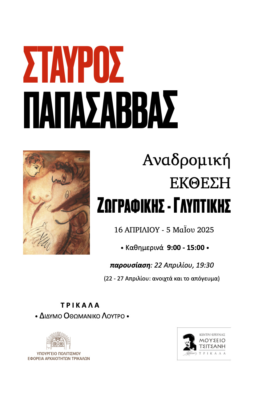 Σας προσκαλούμε στα εγκαίνια της αναδρομικής Έκθεσης Ζωγραφικής – Γλυπτικής του STAVROS (Σταύρος Παπασάββας, 1928 -2018) την Τρίτη 22 Απριλίου 2025 και ώρα 19:30 στο Δίδυμο Οθωμανικό Λουτρό – Μουσείο Τσιτσάνη στα ΤΡΙΚΑΛΑ.