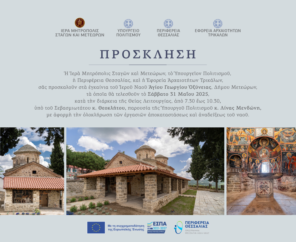 Η Ιερά Μητρόπολις Σταγών και Μετεώρων, το Υπουργείον Πολιτισμού, η Περιφέρεια Θεσσαλίας, και η Εφορεία Αρχαιοτήτων Τρικάλων, σάς προσκαλούν στά εγκαίνια τοῦ Ιεροῦ Ναοῦ Ἁγίου Γεωργίου Ὀξύνειας, Δήμου Μετεώρων, τά ὁποία θά τελεστοῦν τό Σάββατο 31 Μαΐου 2025, κατά τήν διάρκεια τῆς Θείας Λειτουργίας, ἀπό 7.30 ἕως 10.30 π.μ, ὑπό τοῦ Σεβασμιωτάτου κ. Θεοκλήτου, παρουσία τῆς Ὑπουργοῦ Πολιτισμοῦ κ. Λίνας Μενδώνη, μέ ἀφορμή τήν ὁλοκλήρωση τῶν ἐργασιῶν ἀποκαταστάσεως καί ἀναδείξεως τοῦ ναοῦ.
