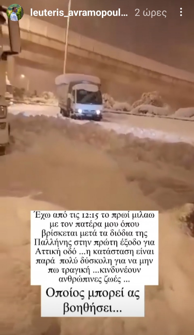 Όπως έκανε γνωστό Λευτέρης Αβραμόπουλος μέσα από τα social media και με έκκληση για βοήθεια προς όποιον μπορεί να βοηθήσει τόσο τον πατέρα του αλλα και τους υπόλοιπους οδηγούς, ο πατέρας του Νίκος βρίσκεται εγκλωβισμένος στην κακοκαιρία μετά τα διόδια της Παλλήνης στην πρώτη έξοδο για την Αττική οδό.